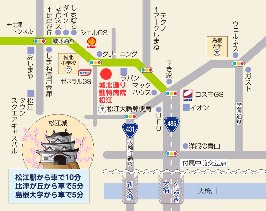 比津トンネルを抜けて東方向へ進み、「みしまや」「しまね信用金庫」がある交差点を直進してください。